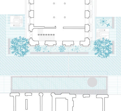 Du côté de la façade néoclassique, une émergence en béton organise les accès, des jardinières, des bancs. C’est l’exercice du trottoir.
