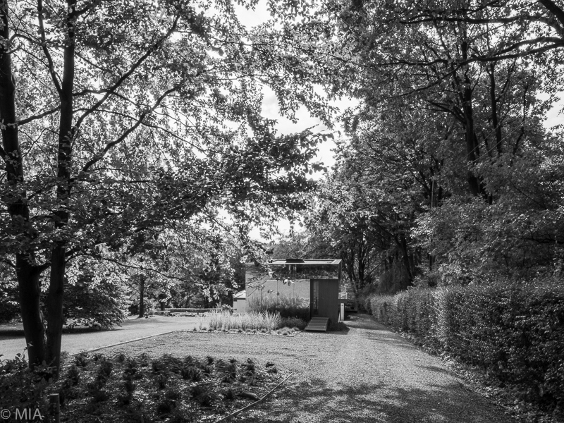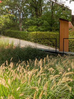 L’accès se fait via une petite passerelle en caillebotis métallique, flottant au-dessus d’un nuage de graminées, qui mène à une porte de bois découverte par l’extrusion de la peau miroir sur l’angle nord-ouest.