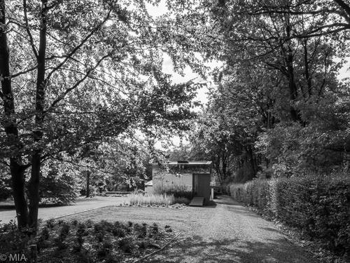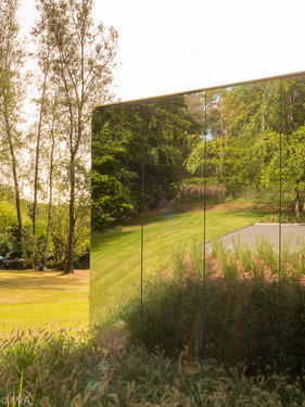 - Le volume s’implante dans le prolongement d’une maison construite dans les années 70 dans un environnement fortement boisé, devant les garages, dont il reprend le langage architectural pour le soubassement (briques peintes, têtes de maçonnerie, hauteur). Posé sur ce soubassement, on retrouve la « boite miroir » qui abrite les fonctions profes- sionnelles. Ce volume est recouvert d’une peau miroir afin de « disparaitre » dans son environnement. Grâce à la forte capacité de réflexion de ce bardage, le nouveau bâti- ment se fond littéralement dans le site. De manière presque surréaliste, la grande baie carrée du bureau donne l’impression, depuis le jardin, d’une immersion dans l’espace intérieur, au travers d’une entaille dans la végétation posée sur un socle de briques. Les autres baies étant dissimulées derrière la peau translucide (verre SGG Mirastar® ), elles ne sont perceptibles qu’à la nuit tombée.[...]