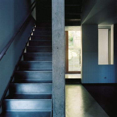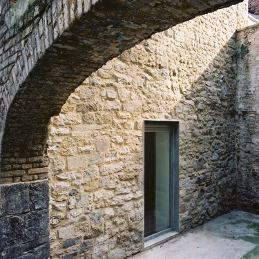 Le traitement contemporain de la porte d'entrée et des châssis de fenêtre installe un indispensable autre rapport au temps et ainsi l'idée de mouvement, de l'éphémère et de la continuité. L'aménagement intérieur est conçu sur le principe de "la maison dans la maison" avec la même tension.