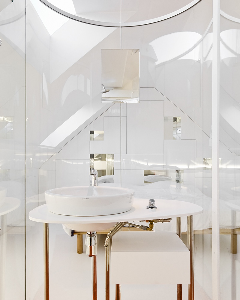 L’ensemble est composé de blanc et de reflets agrandissant les volumes, ouvrant les vues, offrant des effets de surprise et troublant les sens.