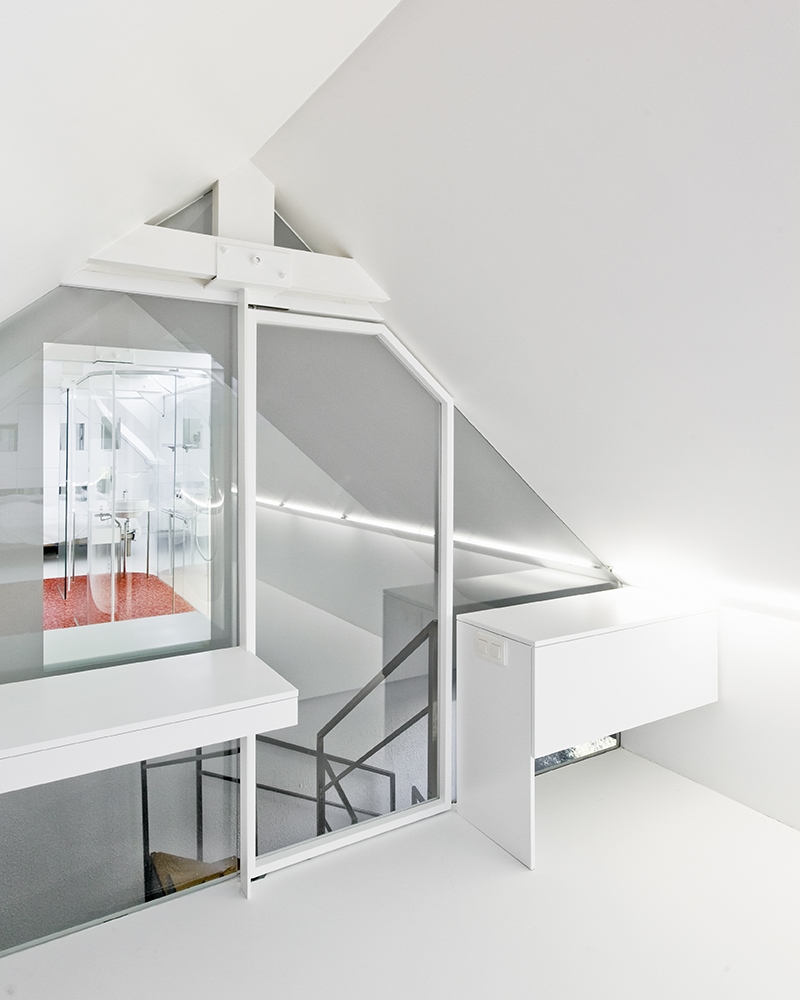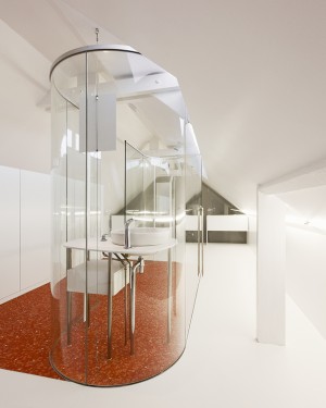 Il en découle tout d’abord une organisation rationnelle successive des différentes fonctions/séquences : 1. coiffeuse / coin lecture 2. salle de bains 3. chambre. La salle de bain au centre de l'espace est composée d'une boîte en verre courbe, articulant les volumes tout en offrant une transparence entre eux. Un lanterneau est découpé tout en longueur dans la toiture qui illumine l’espace.