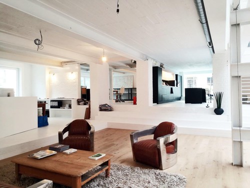 Dans le bureau, l'aspect industriel est volontairement conservé, de même que les grands espaces à l'éclairage zénithal. Les particularités du bâtiment existant ont pour résultat l'implantation de la petite salle de réunion et des espaces servants un demi-niveau plus haut que l'espace de travail.