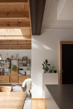 Dans le combles, une lucarne généreuse apporte un maximum de lumière à la cage d'escalier et créer un espace dédié à la méditation et au yoga.