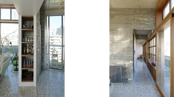 Le projet est fortement contraint par la structure et les gaines techniques des étages inférieurs aux plans irréguliers et accidentés. Pour avoir des espaces aussi libérés et rationnels que possible, trois noyaux de services articulent l’espace : circulation, cuisine et salles de bains. Libéré de toutes cloisons, au 13ème on déambule entre intérieur et extérieur toujours entre un noyau et un autre.