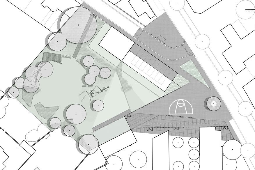 Le travail sur la topographie permet de gérer des pentes douces pour les usagers lents tout en articulant des espaces hauts (esplanade ouverte en lien avec les cours d’école, aire de sport et de rencontre) et des espaces bas (jardin public fermé la nuit, plaine de jeux).