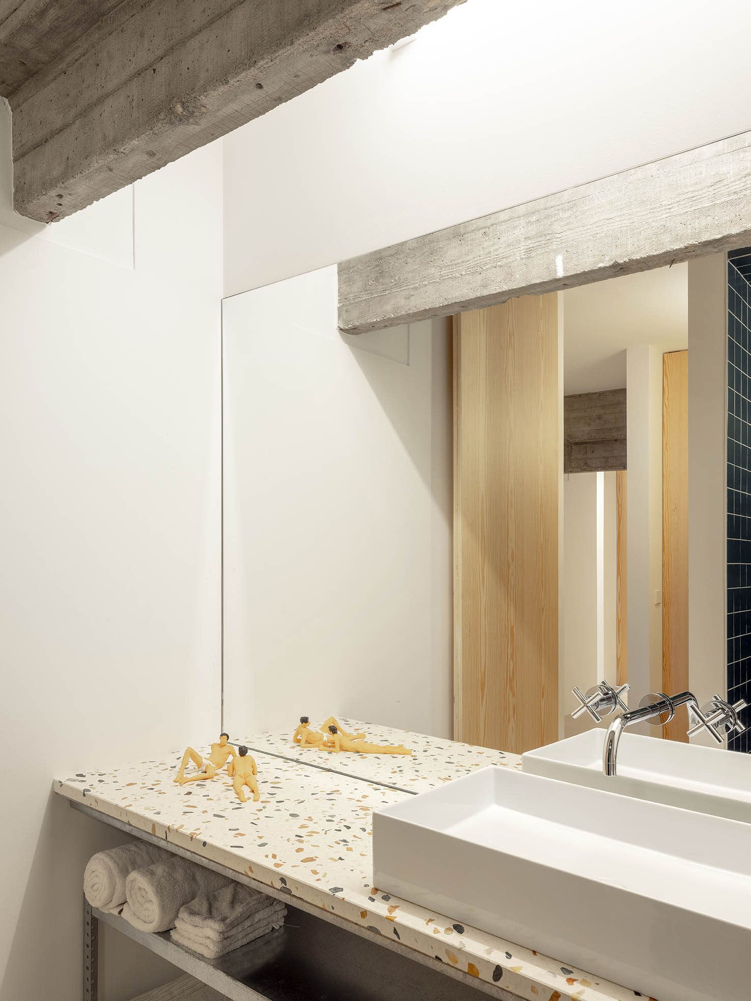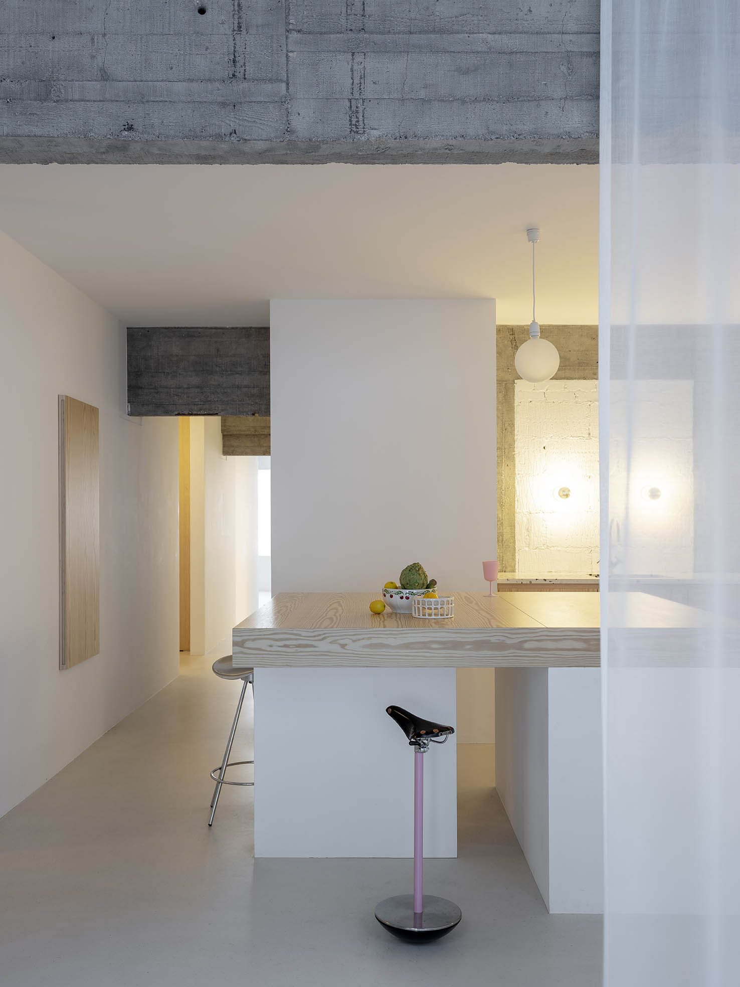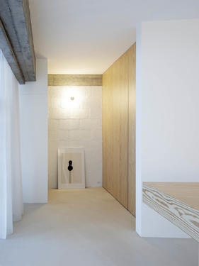 Les bétons sont mis à nu, exprimant leur maladroite construction alors que les structures sont dégagées et soulignées par des p(l)ans verticaux et horizontaux qui s’en décrochent, rappelant les préceptes miessiens de division spatiale. Les pans de bois glissés par touches viennent apporter chaleur au foyer tout en libérant les nouveaux pans de murs qui dans leurs surfaces parfaitement lisses, contrastent avec le remplissage des murs périphériques, révélé et peint en blanc, exposant la fragilité de la tectonique à l’oeuvre.