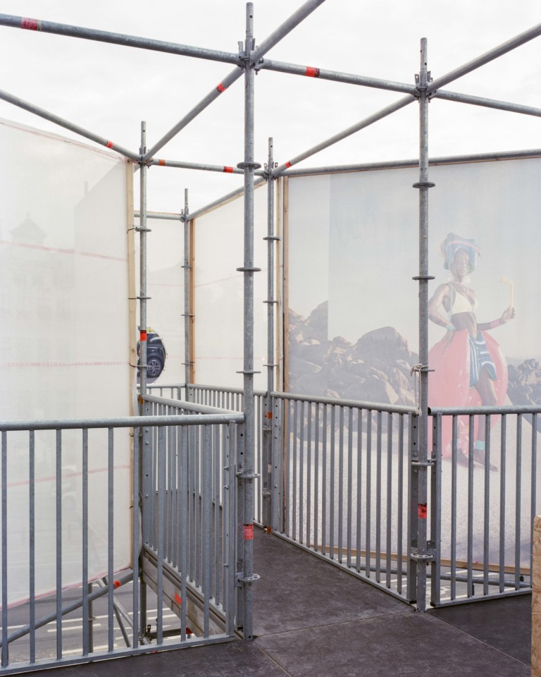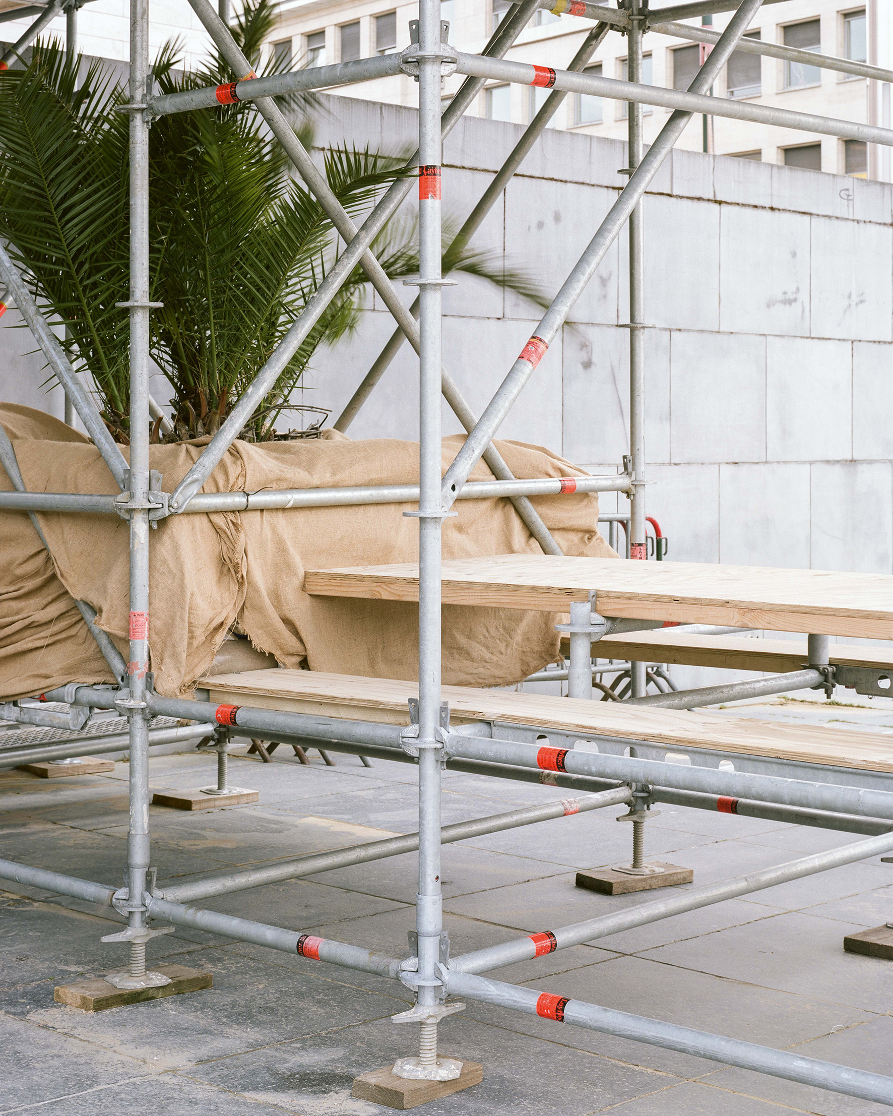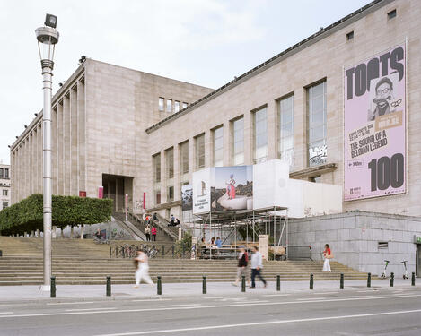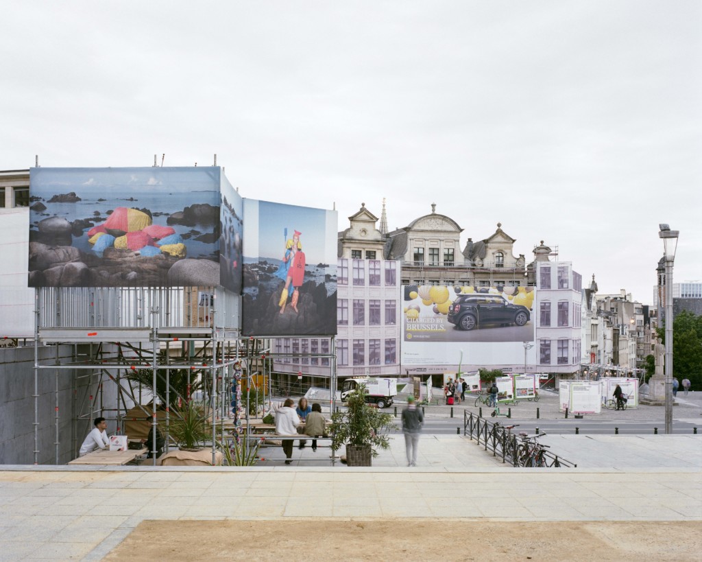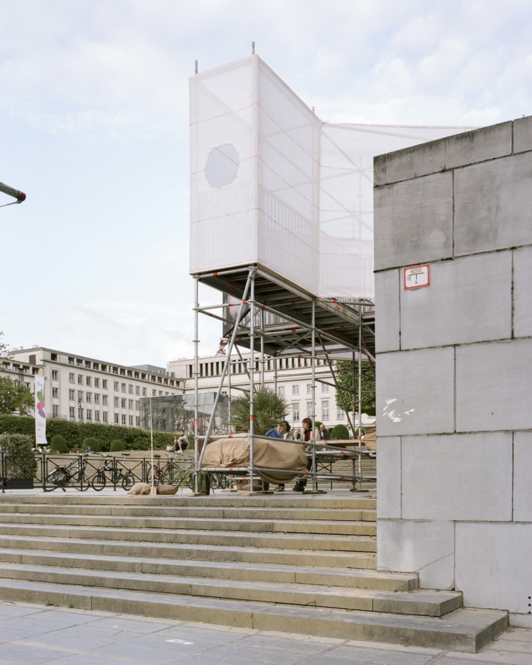- Le projet a été de faire disparaître les limites entre ces interventions au sein d'un seul pavillon organisé sur deux niveaux. La recherche de lumière et de hauteur de vue a dessiné un volume aérien rappelant les arbres bien taillés du Mont-des-Arts. Le nouvel ensemble vient habiter, l'espace de quelques jours, cette zone désolée du site. Les demandes des exposants et les contraintes techniques structurelles ont permis d'envelopper un seul et même espace suspendu offrant des nouveaux cadrages sur le site et protégeant, au niveau inférieur, les espaces d'accueil des groupes pour les différents ateliers. Un parcours se crée depuis le trottoir. Il invite le public à gravir les grands escaliers de pierre bleue jusqu'à enjamber l'épaisse balustrade et y découvrir le site sous un angle nouveau. Le pavillon éphémère fruit d'une démarche de design durable est uniquement réalisé à partir d'éléments existants réemployés et réemployables. Emprunté du vocabulaire du chantier présent sur les façades historiques toutes proches de la place de l'Albertine, la structure, les planchers modulables, les toiles de protection ou le dispositif de lestage deviennent à la fois support, enveloppe et couverture. L'ensemble se fond et s'amuse de ce décor existant chargé d'informations publicitaires et de couleurs.[...]