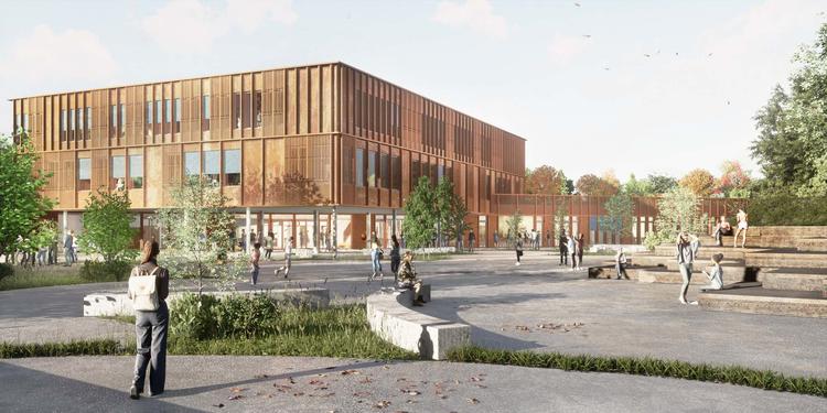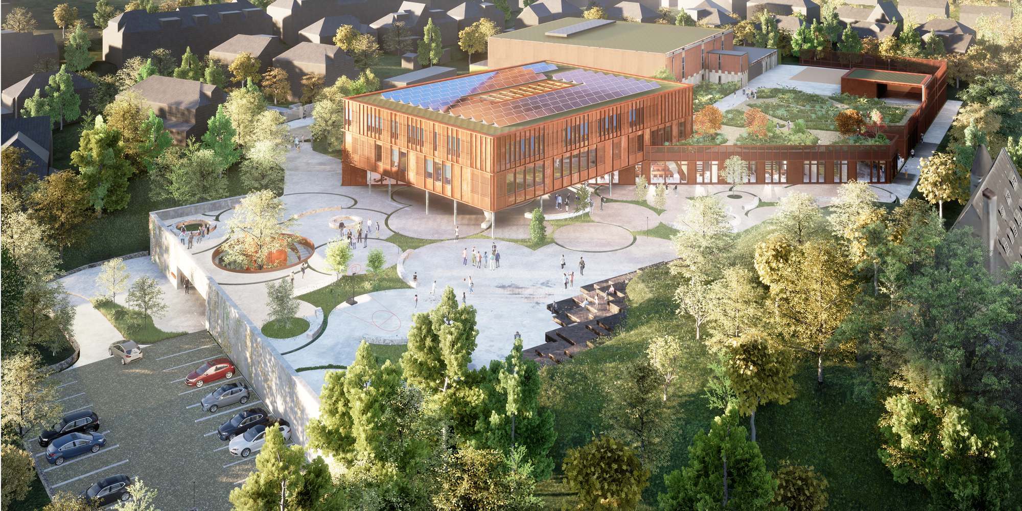 Le nouveau bâtiment prend place au milieu d’une parcelle très boisée de 26 hectares, entourée par des typologies variées. Sa fonction d’équipement public nécessite un langage contemporain, en accord avec sa fonction, qui dialogue avec le paysage en apportant une lisibilité à l’école.