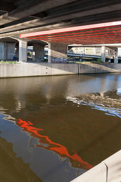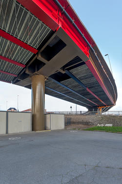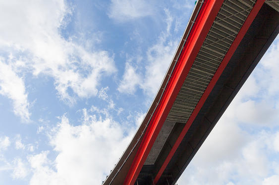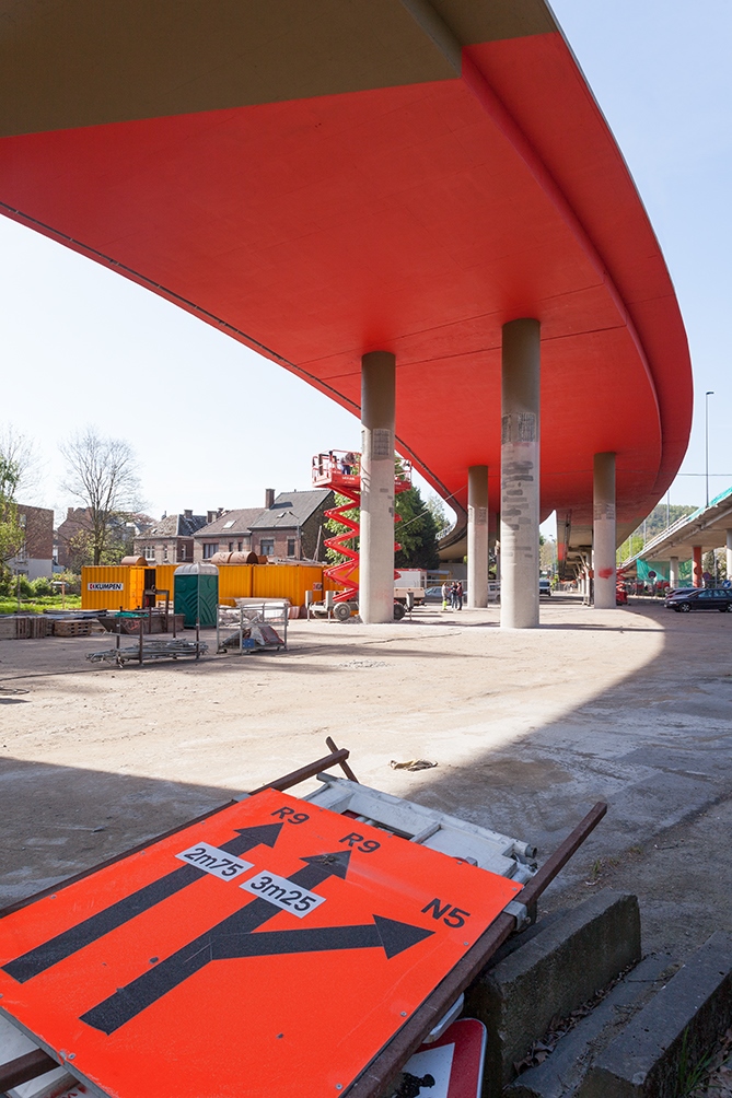 « Le ring de Charleroi (R9), audace d’ingénieurs pour les uns, cicatrice urbaine pour les autres, constitue une ceinture qui entoure et délimite le cœur de la ville. Inauguré en 1975, il s’est, au fil des années, forte- ment dégradé. Entamés en septembre 2014, les travaux de restauration portant sur la partie sud de l’ouvrage réhabilitent 1,8 kilomètre de chaussée. Quinze ponts et viaducs, ainsi que neuf accès et sorties, sont concernés. Considérant l’ensemble des données, Jean Glibert a développé un projet de mise en valeur des ouvrages de franchissement du R9 par de la couleur placée dans leurs parties hautes (poutres maitresses, chevêtres et piles) suivant une volonté de participer à la lisibilité de l’architecture. La proposition se décline au travers d’une vingtaine d’interventions calibrées sur les caractéristiques techniques des ponts, sur les rapports qu’ils entretiennent entre eux et avec le paysage. Trois cou- leurs ont été utilisées : un bronze sourd pour neutraliser l’encombrement visuel des supports structurels ; un noir et un rouge qui dessinent des figures géométriques et séquencent intentionnellement le canevas étouffé. Les recherches « lumière » accompagnent partielle- ment ces intentions. De nuit, l’éclairage maintient le travail lisible, anime le jeu des compositions peintes et crée de nouvelles perspectives invisibles de jour. »