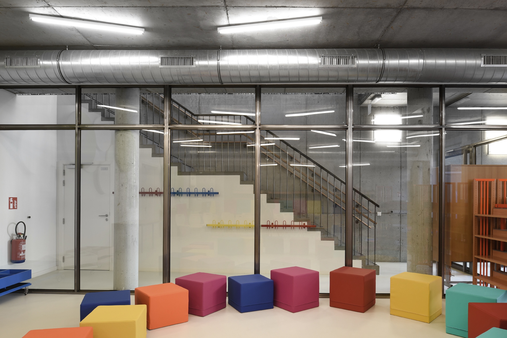 Au-delà de la fonctionnalité, une attention particulière a été apportée à la lumière naturelle, à l’orientation et aux vues depuis les différents espaces, à l’interaction entre intérieur et extérieur et à l’impact du projet sur son contexte environnant. La perméabilité visuelle est encouragée vers l’intérieur de l’ilot à partir de la rue Haute. Les espaces proposés sont généreux en termes de surface et de volume. La façade qui donne sur l’intérieur d’ilot s’ouvre généreusement sur la cour de l’école et offre une toile ludique et colorée aux usagers (professeurs, enfants, etc.) par un brise-soleil coloré. La nouvelle toiture courbe est verdurisée et s’offre à la vue des habitants des logements qui jouxtent le bâtiment.