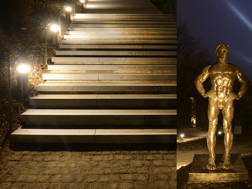 L’illumination du nouvel axe majeur, qui relie le Lac Léman au Musée Olympique, par la création d’une mise en scène lumineuse des statues installées le long, ponctue, rythme la montée et renforce la volonté d’affirmer l’importance de ce grand escalier. De plus, l’illumination de la fontaine, à l’entrée sud, crée le lien entre le parc et le lac, et rappelle le caractère "parc de rive".