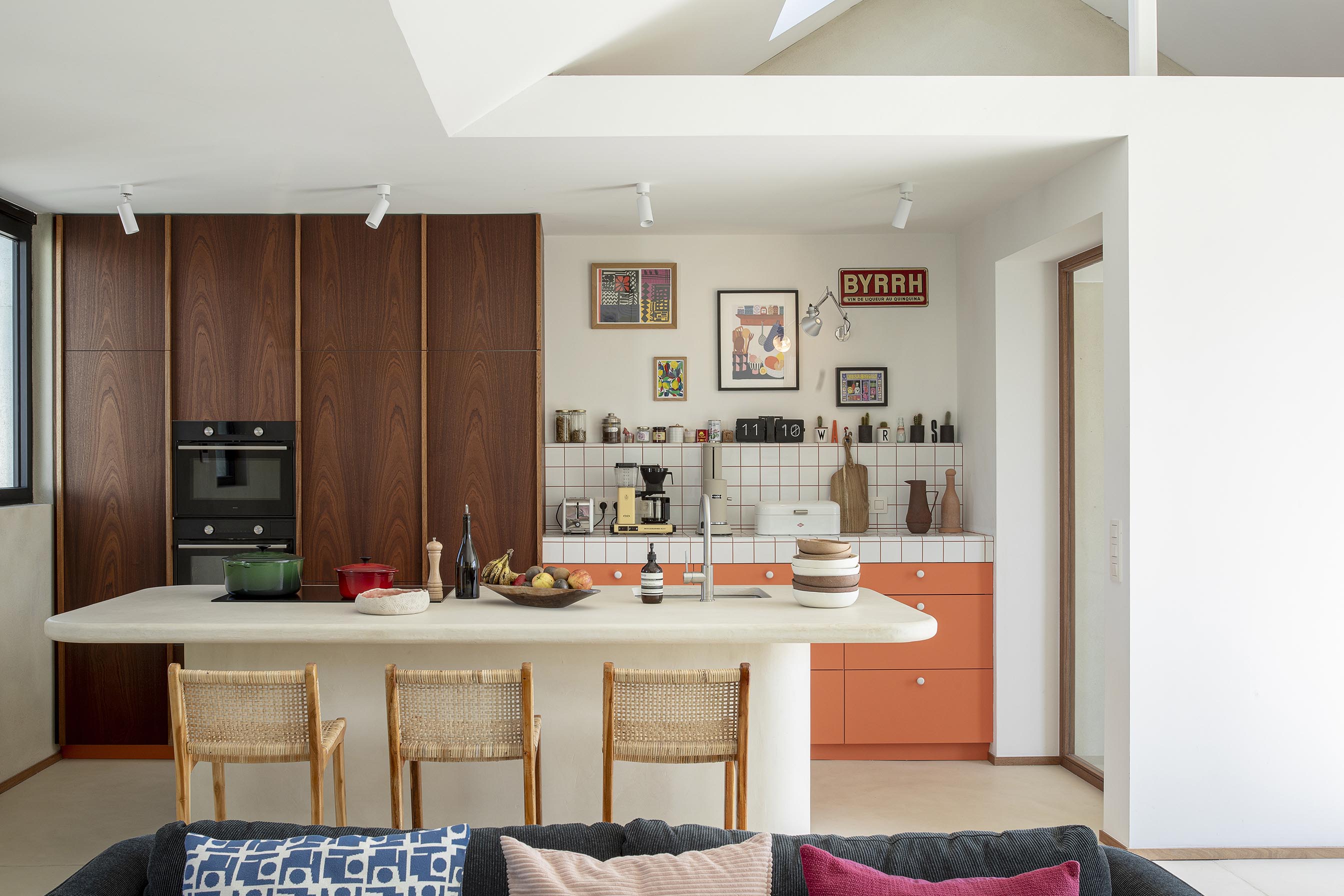 Le projet a été conçu en favorisant l’usage de matériaux écologiques (structure bois avec isolation bio-sourcée, enduits de finition en terre de Bruxelles, …) et de ré-emploi des carrelages, des portes, des meubles de cuisine et des appareils sanitaires ont été importés d’un chantier de démolition ayant lieu au même moment.
