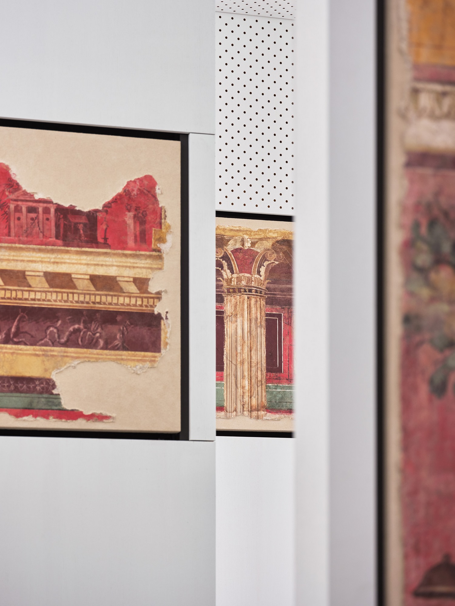 Les fresques sont accrochées selon leurs positions originales dans la villa, hauteurs et relations sont ainsi recréées dans un contexte nouveau. Ces positions correspondant aux anciennes pièces de la villa, s’entremêlent dans un jeu de parois et de plafonds, proposant en plus des relations originales de nouvelles mises en dialogue entre architecture, fresques et visiteurs.