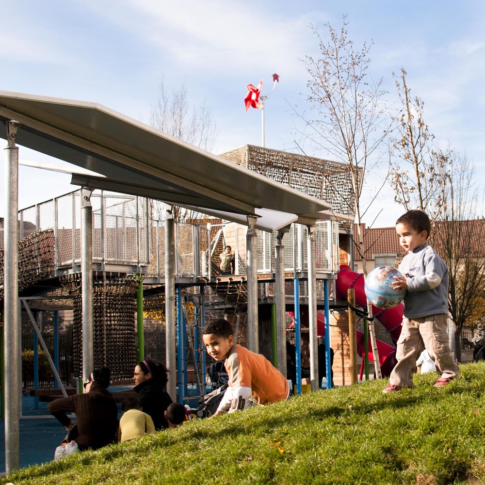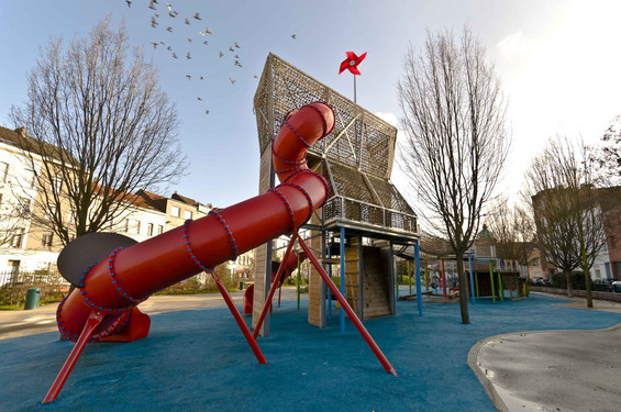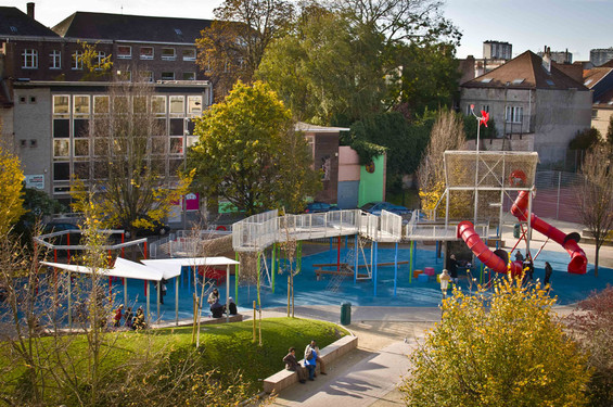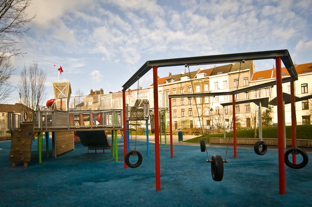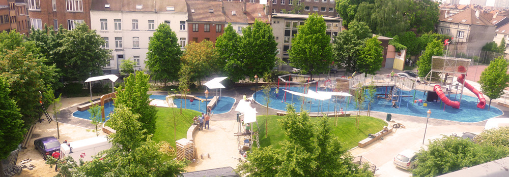 - Deux aires de jeux ont été implantées : une pour les enfants de 0 à 3 ans, l’autre pour les plus grands jusque 12 ans. Le concept est de ne pas enfermer l’imaginaire des enfants dans des formes littérales (le thème “bateau” ou le “château fort”) mais bien de créer des formes abstraites sur lesquelles les enfants projetteront leur imaginaire. Le projet développe des parcours multiples, des utilisations qui ne sont pas purement “sportive” (un jeu d’Oxo, un tableau noir, des tubes-téléphones, un hamac), un bac à sable pour les plus petits et une tour spectaculaire, totem qui entend rendre une certaine fierté aux enfants du quartier.[...]
