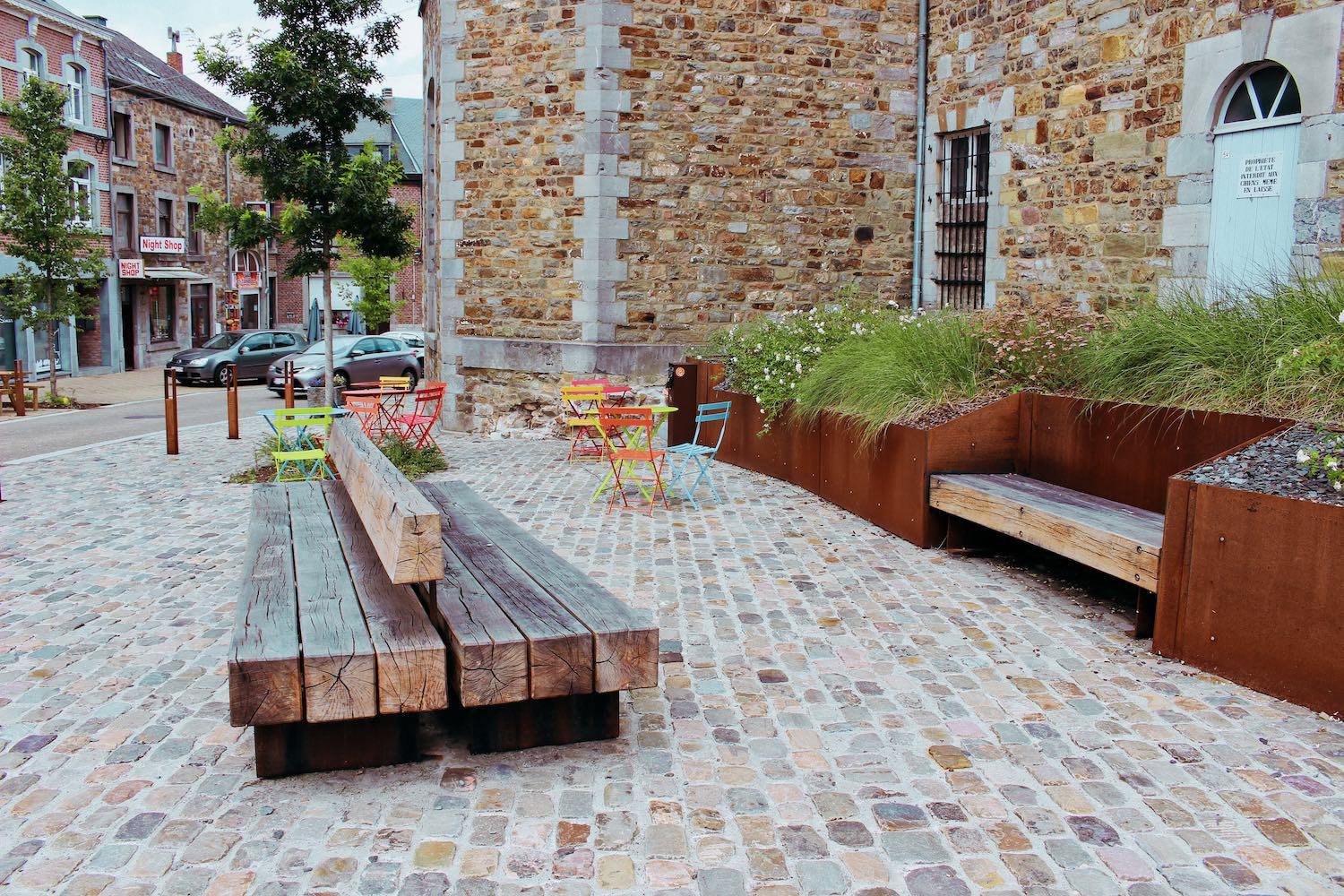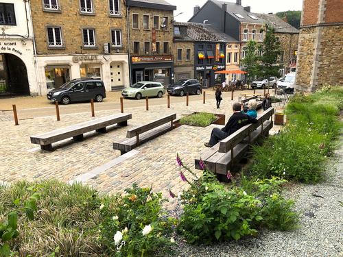 La présence végétale est un élément récurrent dans le projet. Sur la place Verte, un groupe d’arbres denses rappelle la forêt proche. En montant vers la commune, on rencontre des essences rustiques appartenant au monde des champs. Autour de la fontaine, on a planté des roses, autre symbole de Saint-Hubert qui a compté un citoyen d’exception: le célèbre dessinateur des roses à la cour de France, Louis Redouté.