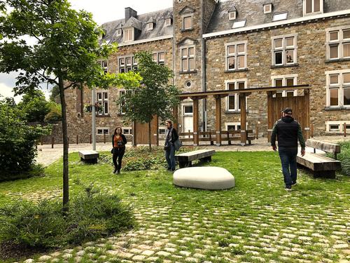 Notons que les eaux de pluie sont systématiquement dirigées vers les plantations, dont les bacs sont sans bordures. De nombreux joints entre les pavés sont ouverts. Une végétation indig