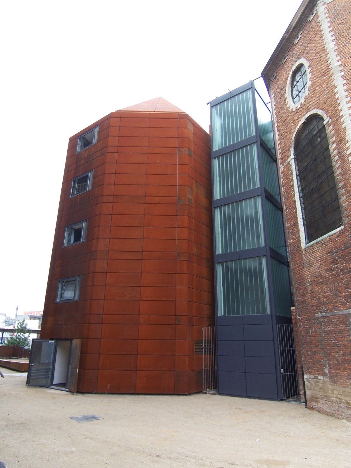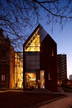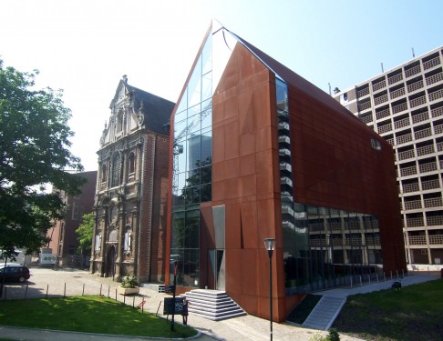 - Lauréat du concours, en association avec l'architecte italien Andrea Bruno, Sum a opté pour le maintien tel quel de la chapelle existante, classée comme monument, en tant que salle de spectacle polyvalente. Toutes les fonctions logistiques (accueil, restaurant, bureaux, salles de répétition, petite salle de représentation, résidences pour artistes, équipements techniques, etc.) ont été intégrées dans un nouvel immeuble contemporain présentant exactement la même volumétrie que la chapelle existante. La chapelle baroque se voit ainsi adosser un ange protecteur face au tissu urbain morcelé du quartier.[...]