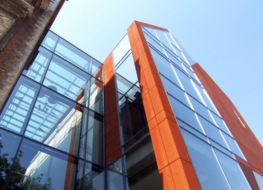 La liaison entre les deux volumes forme un élément crucial du projet : trait d'union entre deux époques, elle se veut à la fois subtile et lisible. Entièrement vitrée, elle accueille un escalier monumental et un ascenseur. Elle instaure le dialogue entre la chapelle baroque du XVIIe siècle et l'extension contemporaine du XXIe siècle. La modularité et les matériaux des façades réfèrent à la chapelle existante, avec une touche contemporaine. Ainsi l'acier corten renvoie aux briques rouges de façade et le revêtement en inox ainsi que les parties vitrées forment des réminiscences des bandeaux décoratifs et des ornements en pierre blanche.
