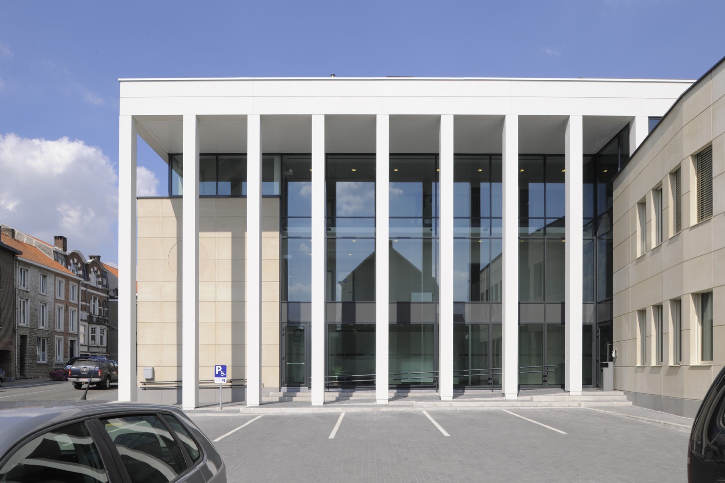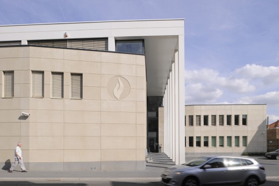 Le concept a été imaginé sur base d’un socle, qui tire parti du dénivelé du terrain et qui abrite le complexe cellulaire, les parkings et les archives. Le demi-niveau permet une pénétration de lumière naturelle et une ventilation efficace de ces locaux. Au-dessus, la forme du bâtiment (en « L ») permet simultanément :