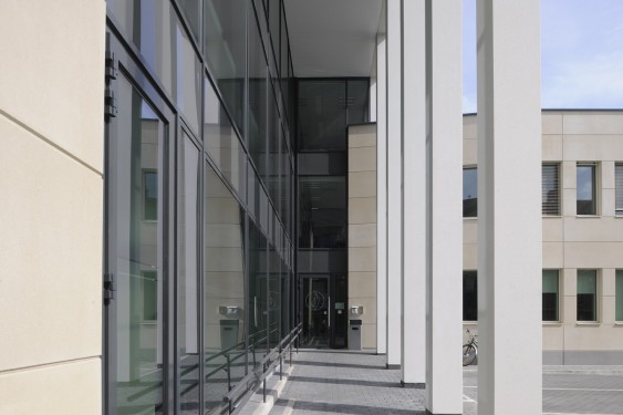 Bâtiment basse énergie avec une enveloppe très performante, une toiture végétale et un vitrage super isolant et blindé.
