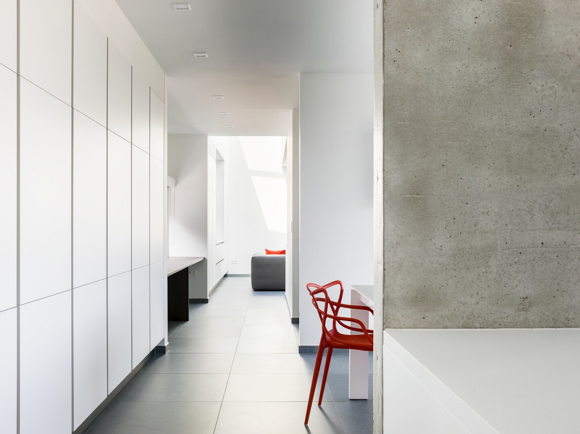 - Le souhait des Maîtres de l’ouvrage était à la base assez simple puisqu’il tenait en la programmation classique d’une habitation unifamiliale. Après une recherche infructueuse de terrain disponible dans la région satisfaisant à leur demande, le regard s’est porté sur une zone encore libre d’espace résiduel située à l’arrière de leur commerce.[...]
