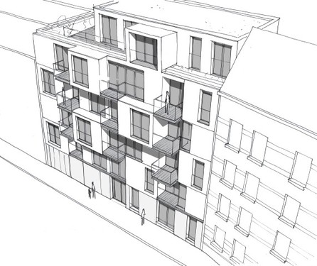 - Le projet consiste en la nouvelle construction d’un immeuble à front de rue de gabarit R+4+5ème étage en retrait. Le projet prévoit l’aménagement de 15 logements répartis selon différentes tailles : studios, 1CH, 2CH et 3CH. La composition de la façade principale tend à allier une rythmique verticale basée sur la trame traditionnelle du parcellaire bruxellois et des lignes de force horizontales existantes dans la rue. Ce double langage permet une modulation d’éléments qui se présentent soit en retrait, soit saillants, et qui se compensent par rapport à l’alignement général de la façade. Les éléments en saillies ne se présentent qu’à partir du 2ème étage afin de permette une hauteur libre généreuse par rapport au trottoir. Les différentes baies se déclinent selon un même module, dont la proportion verticale est renforcée par des linteaux Alu attenants au châssis. La façade arrière est traitée selon les logiques d’îlotet de mitoyenneté bruxelloises, distinguant les élévations fort ornementées au niveau de l’espace public et les élévations en intérieurs d’îlots plus équilibrées et moins traitées plastiquement.[...]