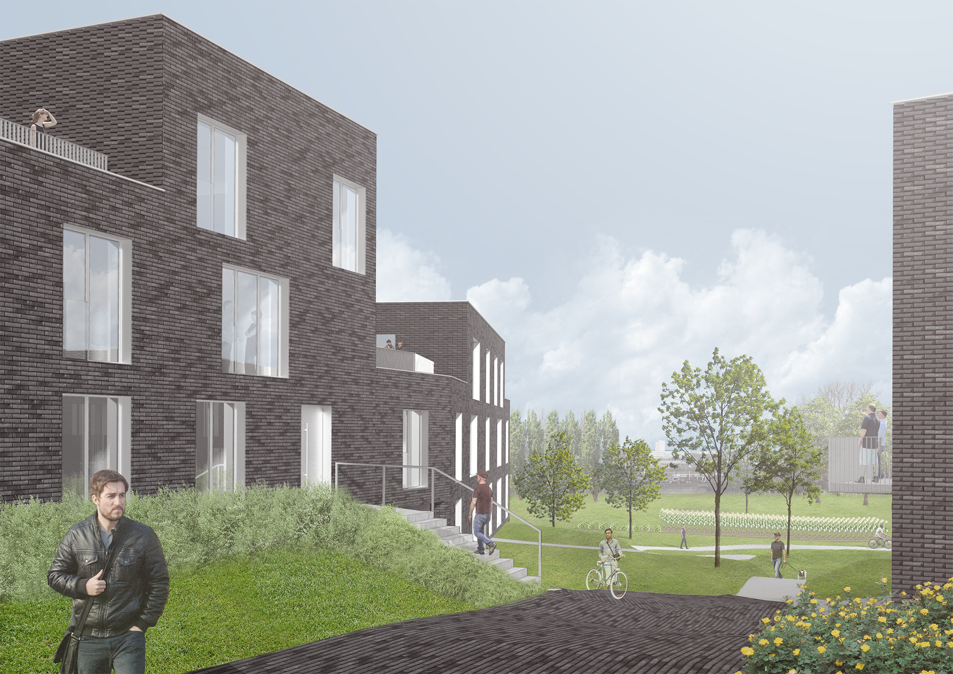 - Situé à Haren, le projet s’implante dans un environnement semi-rural caractérisé d’une part, par les constructions éparses, regroupées classiquement le long des rues d’Harenberg et Klesper, et d’autre part, par la présence du site classé du Castrum adjacent au projet. Le conformisme des gabarits existants et la présence d’un dénivelé important offrent à ce projet des contraintes intéressantes à exploiter pour proposer une implantation qui tient compte de la préservation de l’intimité des habitations existantes tout en offrant une nouvelle densité d’habitations, orientées en fonction de la course du soleil. Tout en mettant à l’honneur le site paysager du Castrum, l’ambition du nouveau projet se doit de répondre à une volonté de proposer une articulation urbaine subtile entre la rue Harenberg, la rue du Klesper et l’intérieur de la parcelle tout en offrant une expression architecturale forte.[...]