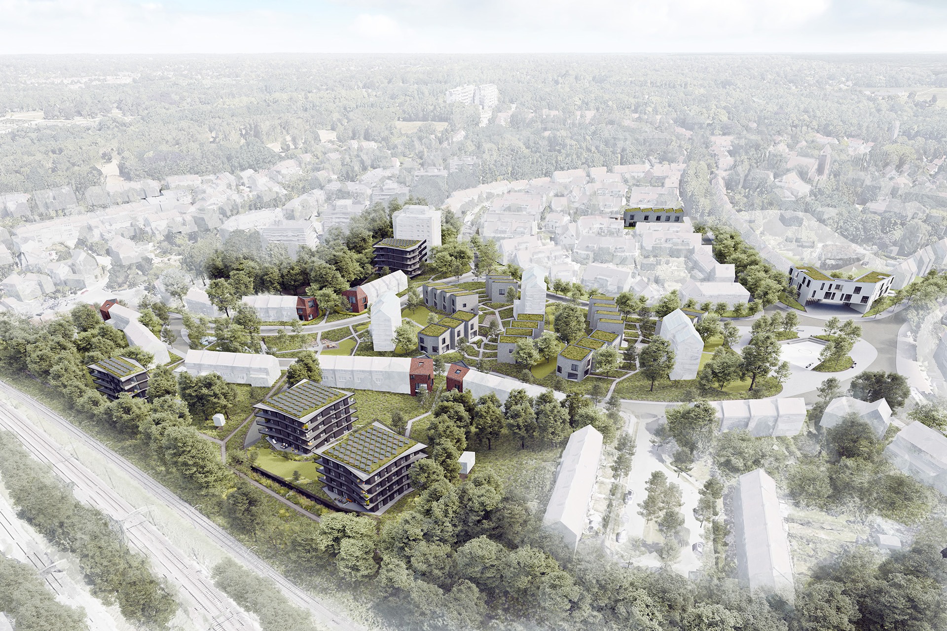 L'îlot central est dédensifié pour préserver au mieux la perception de la topographie existante et les couloirs verts, terrains d’ancrage des nouvelles habitations. Ils se connectent à des places collectives, points d'activation à l'intérieur du site, lieux fédérateurs pour le quartier, un lieu de vie de qualité, fait d'échanges et de rencontres. Ils se liaisonnent aux sentiers déjà présents dans le contexte. Les logements délocalisés retrouvent place sur les pourtours de cette zone sans en perturber la cohérence urbaine