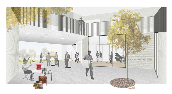 - Le projet s’intègre dans la structure du paysage existante, « vide dans la masse ». Il densifie ce quartier en créant des liens entre les ilôts et en requalifiant les espaces verts résiduels des fronts bâtis. Cela conserve et renforce les caractéristiques urbaines et architecturales de la cité-jardin, et respecte son aspect paysager.[...]