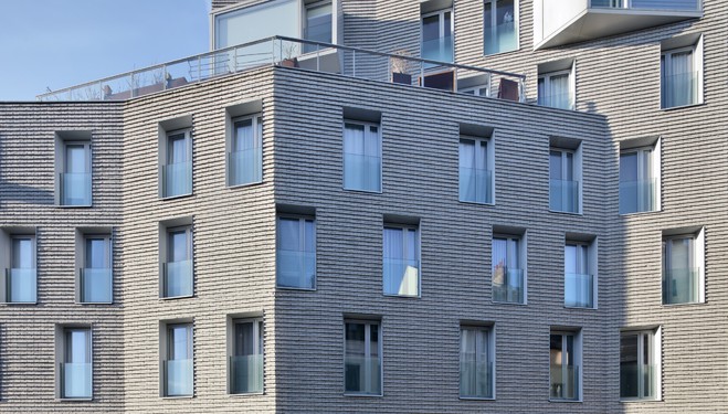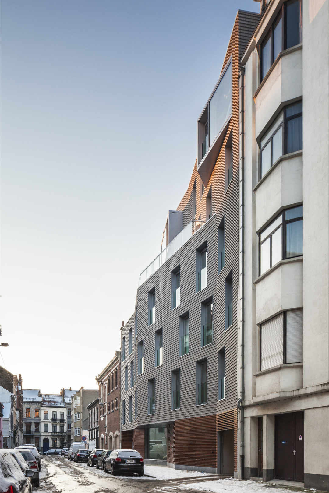 A rue, la façade de 25m est travaillée comme une feuille de papier dont les plis articulent les liaisons avec les bâtiments adjacents et atténuent visuellement sa grande taille. Ils offrent également une lecture de facettes multiples qui captent la lumière différemment, et créent un rythme vertical approprié au contexte urbain bruxellois.