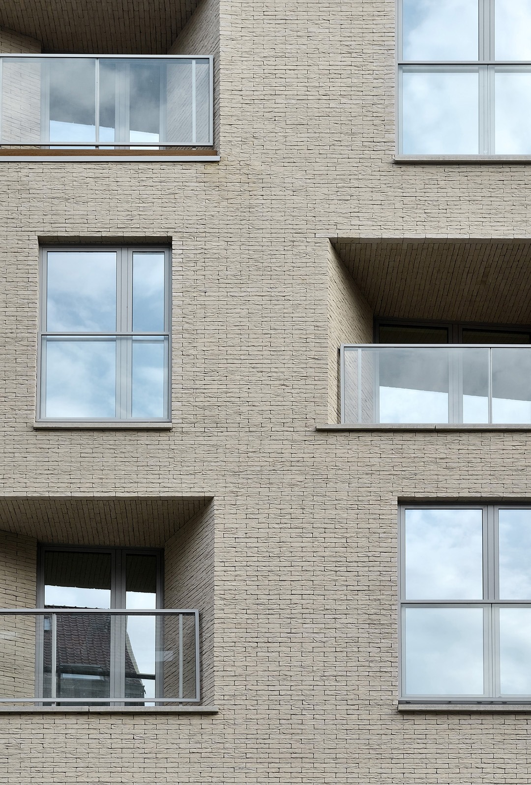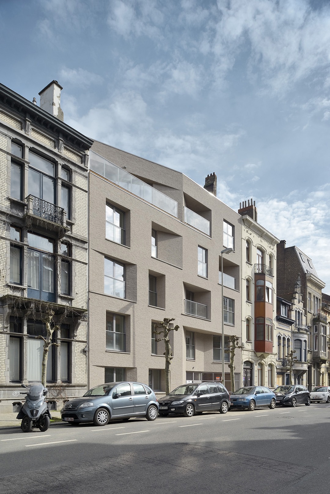 La façade se veut l’interprétation sobre et contemporaine des bow-windows ornant les façades des maisons voisines tout en apportant une composition stricte aux alignements verticaux des baies comme le sont ceux des constructions adjacentes. Les ‘niches’ formées par les creux en façade permettent un rapport des pleins et des vides en dialogue avec le contexte existant.