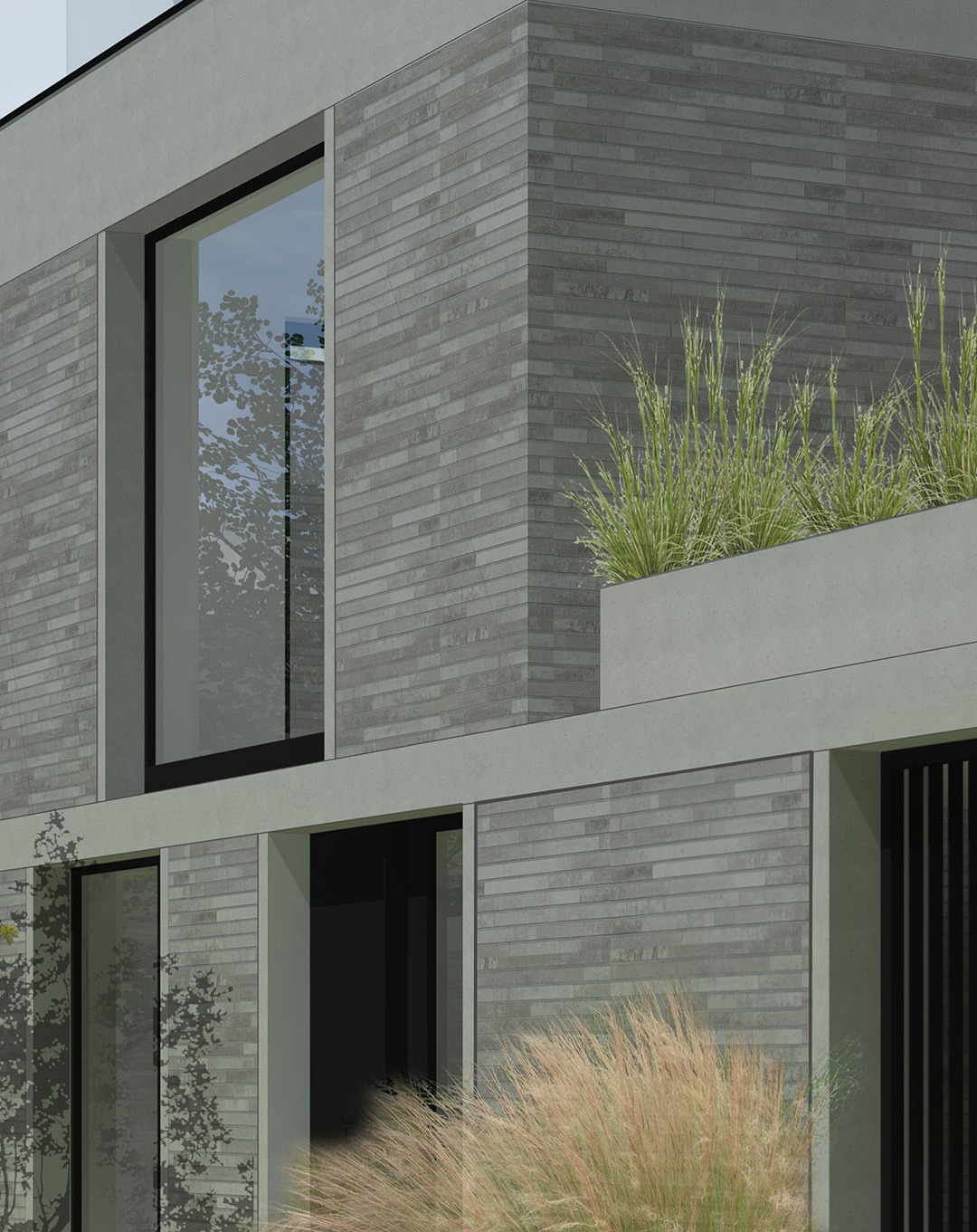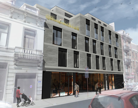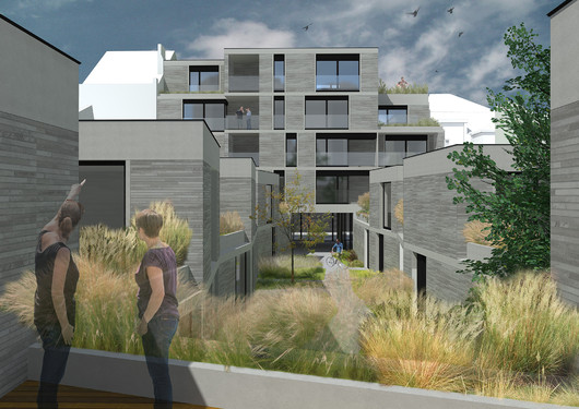 - Le projet propose une articulation urbaine subtile entre les gabarits existants à rue et exploite les caractéristiques morphologiques du site en intérieur d’îlot. Le bâtiment à rue recrée un front bâti continu et se réfère aux rythmes dictés par les constructions existantes, sur un principe de mise en place classique d’immeuble à appartements. Des maisons unifamiliales en intérieur d’îlot se positionnent de façon beaucoup plus contextuelle, en s’appuyant sur les murs mitoyens en alternant terrasses et patios. Ces unités sont tournées vers l’intérieur du site de façon centripède, pour limiter l’impact du projet sur le voisinage. Le principe jour/nuit est inversé avec les séjours situés en haut pour maximiser les qualités d’habitabilité. Ils sont placés en alternance pour limiter les vis-à-vis internes au site. Ces maisons s’articulent autour d’un jardin partagé, équipé des installations collectives, sur le principe réinventé du carré ucclois. L’architecture se veut sobre et référence au catalogue typologique présent dans la rue, tant dans sa matérialité que dans ses proportions.[...]
