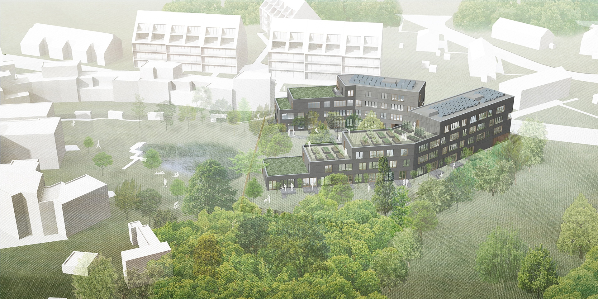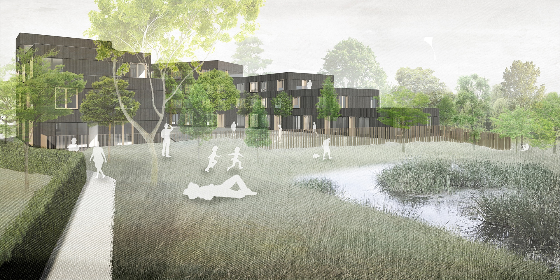 - Le projet se développe sur quatre niveaux afin de respecter les gabarits existants le long de la voirie et se poursuit le long de la limite de propriété du côté est, en s’alignant sur l’orientation d’implantation de la cité jardin du Melkriek. Il préserve l’intimité des habitations existantes et les qualités paysagères du site. La volumétrie va se plier, se développer et s’étirer pour s’ouvrir au paysage, créer des transitions volumétriques et offrir une perméabilité visuelle vers l’intérieur d’îlot. L’utilisation générale du béton texturé renforce l’aspect tridimensionnel généré par les plis, les creux et les légères variations de séquences. La forme résultante respecte les vues existantes du voisinage et offre aux futurs logements, un panorama visuel s’étalant de la zone verte au sud à l’espace paysager à l’ouest. Un jardin collectif, accès du projet, opère la transition entre l’espace public et l’étang, paysage qui se prolonge sur les toitures des bâtiments, grandes terrasses vertes. Il est travaillé par soustraction où des poches végétales sont soustraites afin de créer des cheminements piétons et des zones récréatives. Le gradient d’humidité du sol définit la progression de la végétation suivant la topographie du terrain.[...]