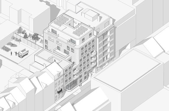 Afin de s’ouvrir à la lumière naturelle, de préserver l’intimité de ses occupants et de relier certains points d’accroches urbains, le volume est traité à la manière d’une sculpture. Des percées verticales sur toute la hauteur du bâtiment sont réalisées pour créer de nouvelles façades intérieures.