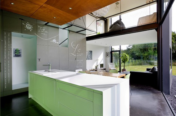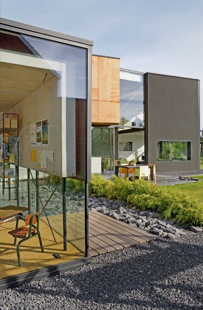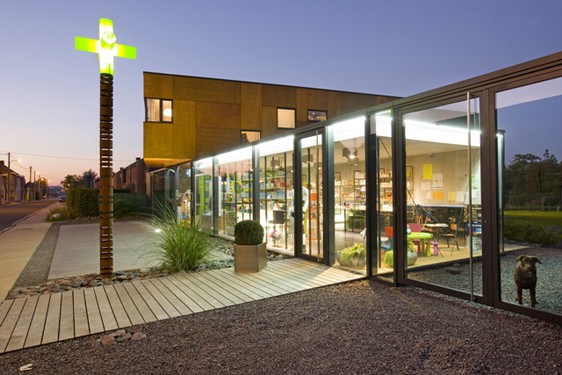 - Construction d’une officine liaisonnée à un logement. Côté nord, un mur aveugle intègre les espaces techniques et de rangement. Les façades est et sud sont généreusement vitrées pour bénéficier de la vue sur le lac et le jardin. La vitrine de la pharmacie clôture la propriété à rue et rassemble les différentes entrées. Au rez, la circulation s’organise autour d’un cube regroupant les réserves, les tiroirs de pharmacie et le mobilier de cuisine. Un «?volume flottant?» en bois regroupe chambres e[...]