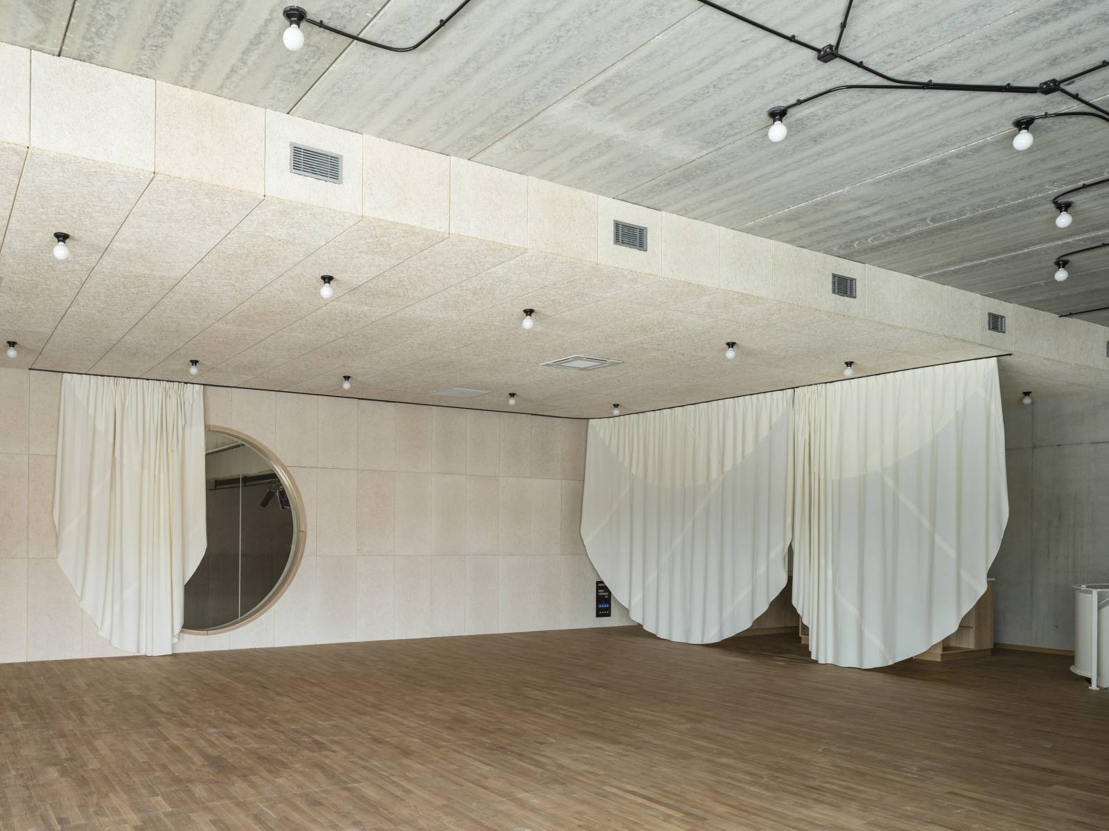 Les espaces intérieurs du Pont des arts sont exemplaires d’une architecture sans revêtement, mais pas sans décoration. À la demande des architectes, Éric Chevalier et Anne Masson ont en effet réalisé de grandes et belles tentures qui sont suspendues à l’entrée des salles de projection. À l’autre extrémité du bâtiment, des rideaux conçus et fabriqués par le tandem bruxellois permettent de partitionner la salle festive sans lui faire perdre son généreux volume, et d’occulter une baie et un bar dans la salle de répétition.
