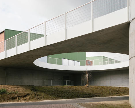 - Soutenu par un grand cylindre de béton, qui fait office d'escalier, ce plateau en béton plane au-dessus de la route. Un vide circulaire offre des vues du plateau aux voitures et aux cyclistes qui passent.[...]