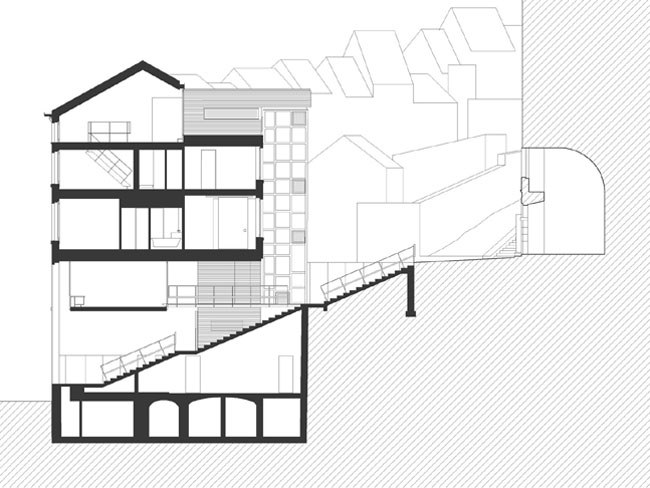 Le logement de fonction, situé au-dessus du passage public, est accessible par l’escalier contenu dans la tourelle en colombage. Son organisation inversée permet d’offrir aux pièces de vie l’intimité nécessaire et de proposer via une terrasse privée un panorama impressionnant sur la ville.