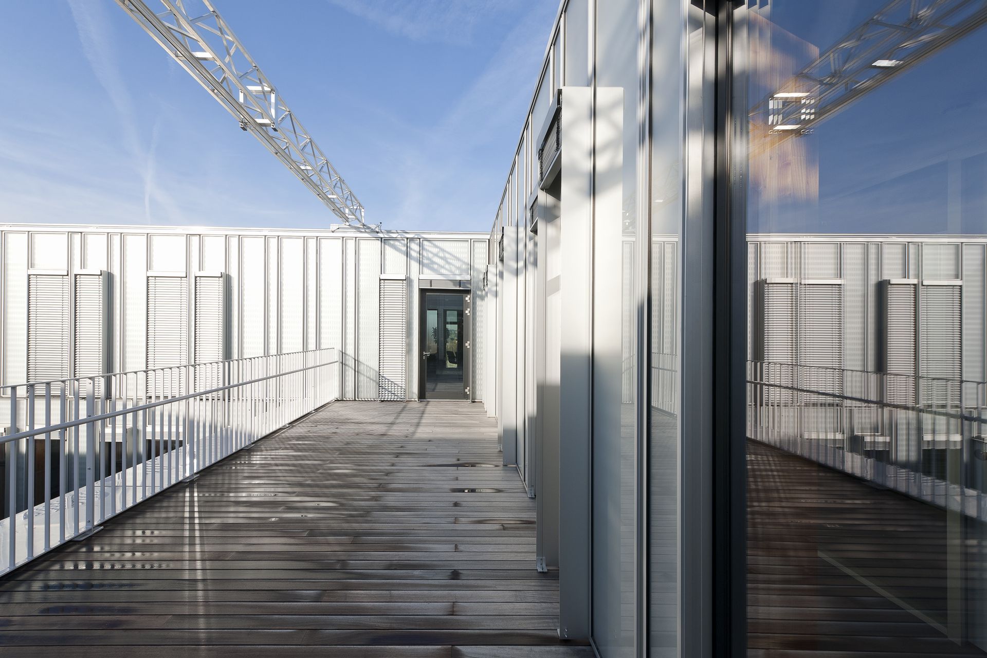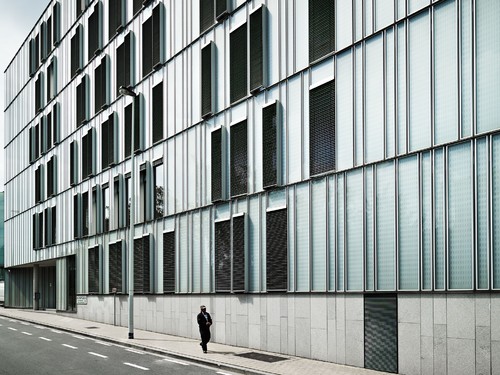 La compacité limite les déperditions thermiques tandis que la structure principale laissée en béton préfabriqué apparent apporte son inertie thermique. La peau est composée de cadres préfabriqués en bois de largeurs variables et placés selon l’organisation optimum des espaces de bureaux à chaque niveau… la marelle résultante des pleins et vides ensuite amplifiée par les volumes saillants des cadres de ventilation à ouverture automatique.
