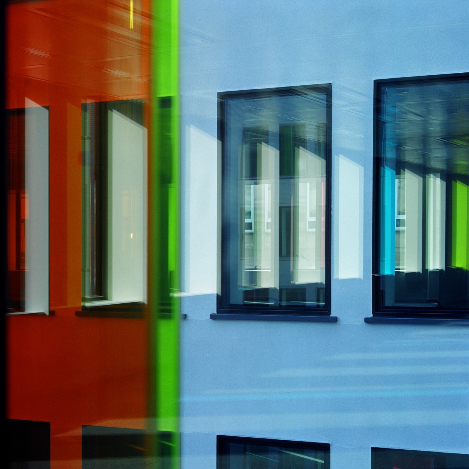 L'espace est redéfini par l'utilisation de la lumière et la couleur, modelé avec l'artiste J. Glibert. L'apparition apparemment aléatoire de vitrages colorés (en fait la résultante de l’organisation intérieure) apporte une note ludique à la façade existante ... ce qui se passe à l'intérieur devient source de l’animation extérieure rendant superflue toute autre intervention formelle ...