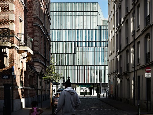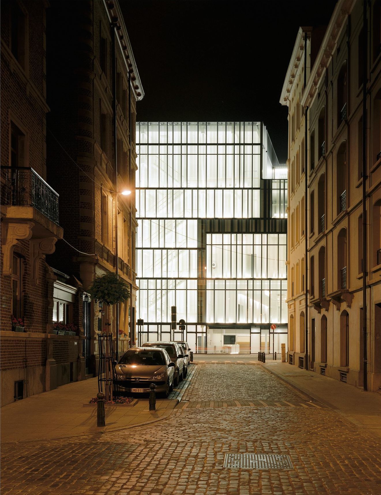 - Le THEATRE NATIONAL est tel un isthme, niché dans le tissu serré du centre-ville, en équilibre entre le rythme effréné du boulevard (entrée principale, guichets, entrée des artistes, ...) et l’ambiance plus tranquille de la rue arrière où les services sont organisés. Il présente aux passants un voile scintillant de verre opalescent et ondulant se transformant au gré des lumières fluctuantes et reflets changeants, résonnant délicatement avec les activités urbaines environnantes. A travers le linceul de sa façade, les ombres de son contenu soigneusement dimensionné apparait, ciselé avec précision : le programme dense appelle à une grande salle, une petite, et une salle de répétition polyvalente. Le foyer serpente langoureusement entre ces fonctions, conçu comme un espace ouvert continu connectant la rue et les toits ... côtés avant et arrière.[...]