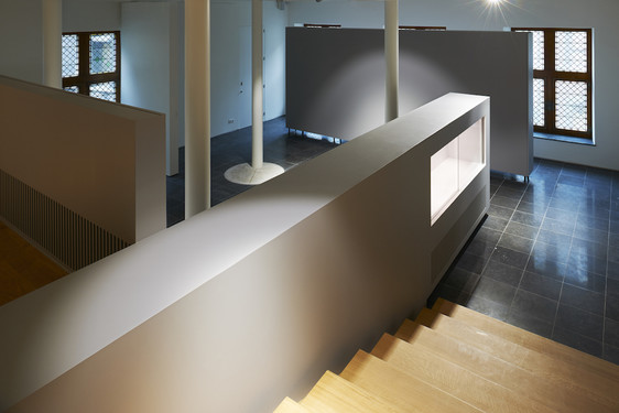 Dans l'aile ouest, une dalle en béton ancrée dans les murs, tel un ponton en lévitation sur l’extrados des voûtes, fait office de poutre-diaphragme de stabilisation.