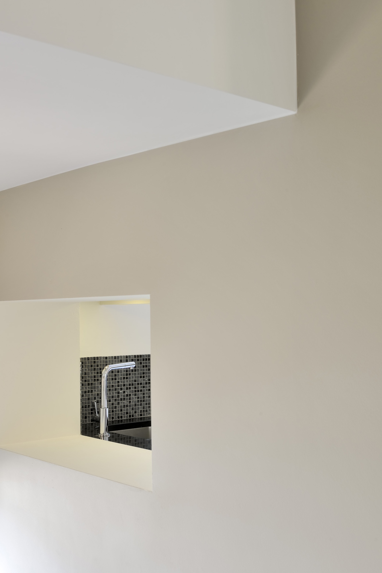 La façade latérale est travaillée dans son épaisseur et bien qu’établie sur la limite côté villa, elle constitue la troisième façade. Elle est composée de pans opaques face à la villa.
