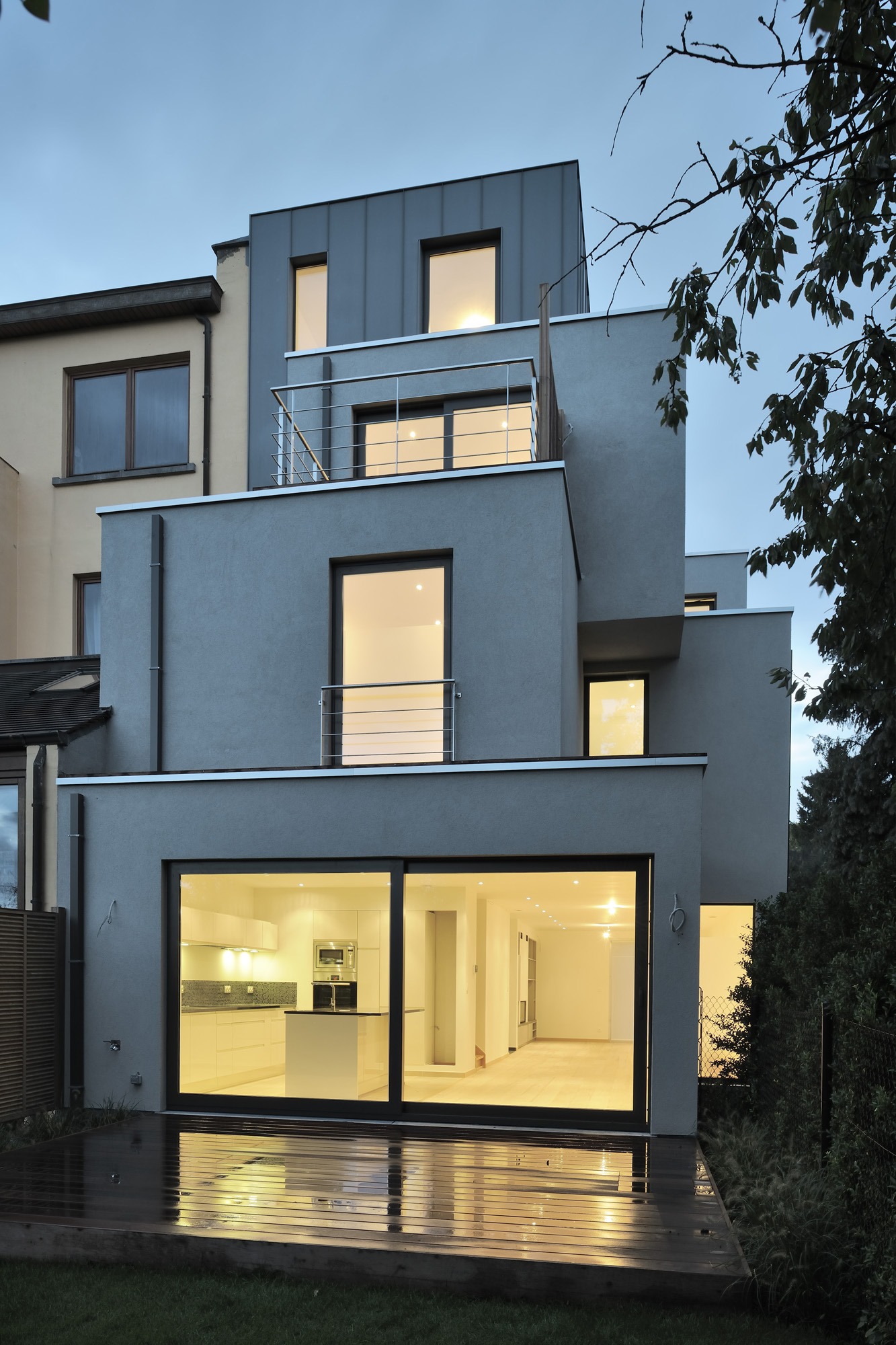 A l’arrière, les retraits observés rapprochent la construction du profil de l’immeuble voisin. Les volumétries mises en place évitent la projection d’ombres supplémentaires sur la villa et son jardin.