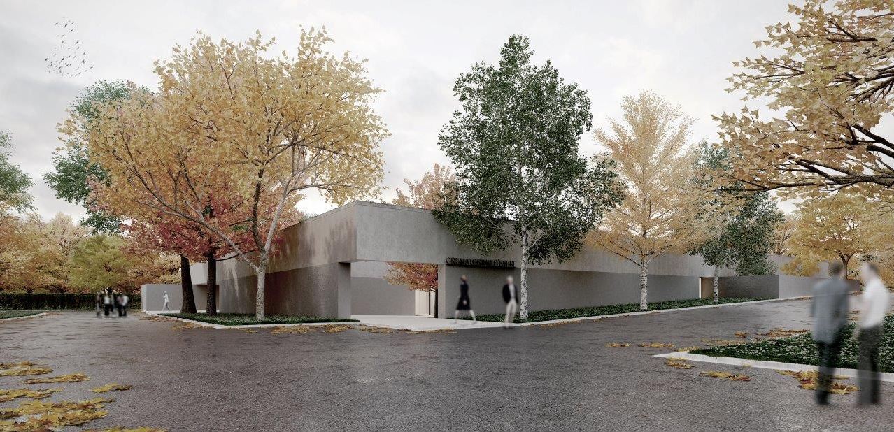 L'édifice prend la mesure du lieu, bordé d'une frange verte, protégeant l'espace du recueillement. L'entrée se fait sur l'angle, au croisement de l'axe principal du cimetière et d'un chemin, au travers d'un patio, auprès d'une fontaine. L'accès, en légère déclivité, convie familles et proches. Le patio se fait préface, préambule propice à s'inscrire dans le recueillement. L'espace accueille, dessert les salles de cérémonie baignées de lumière naturelle, pouvant s'unifier avec le foyer, pour les grandes assemblées. (...)