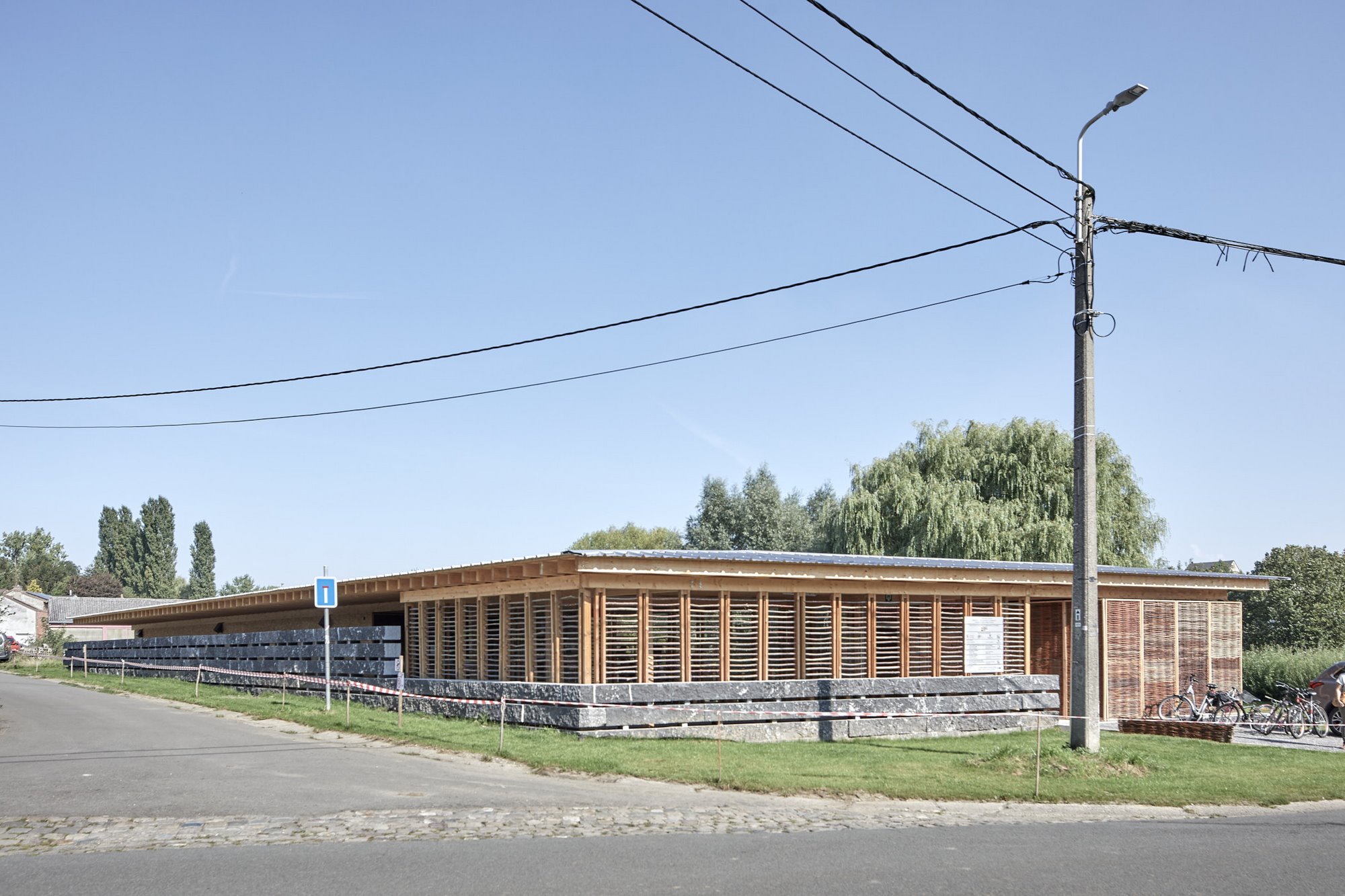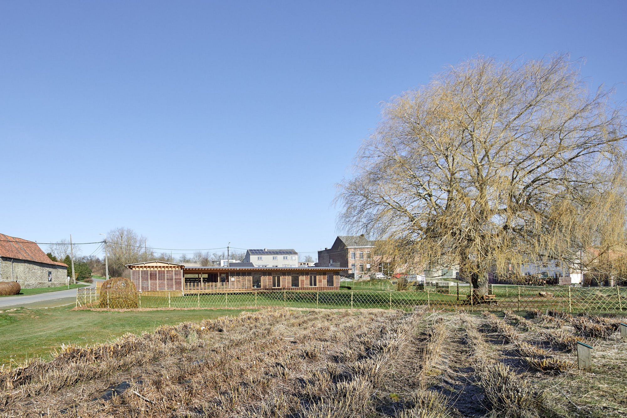 L’ensemble reste néanmoins mû par la volonté de créer une architecture exigeante . La structure en bois rythme les espaces et les rapports au paysage, un mur en pierre assied l’ensemble et donne une force au lieu lui permettant de rivaliser avec les anciennes fermes historiques aux abords du site, les espaces mettent les utilisateurs en contact avec les matières et l’environnement immédiat. Il en résulte un lieu simple, naturel, sans démonstration, un outil au service de la ruralité. Particulier à ce projet, le bardage conçu en panneaux de saule tressés. Ce point condense à lui tout seul l’esprit du projet : le matériau saule a été produit et cueilli sur place, les panneaux de saule ont été réalisés par l’asbl MMER pour lui permettre de valoriser son savoir-faire, la maintenance de ces panneaux peut être réalisée également par l’asbl (diminution frais de maintenance). La durabilité environnementale rencontre ainsi la durabilité économique et social