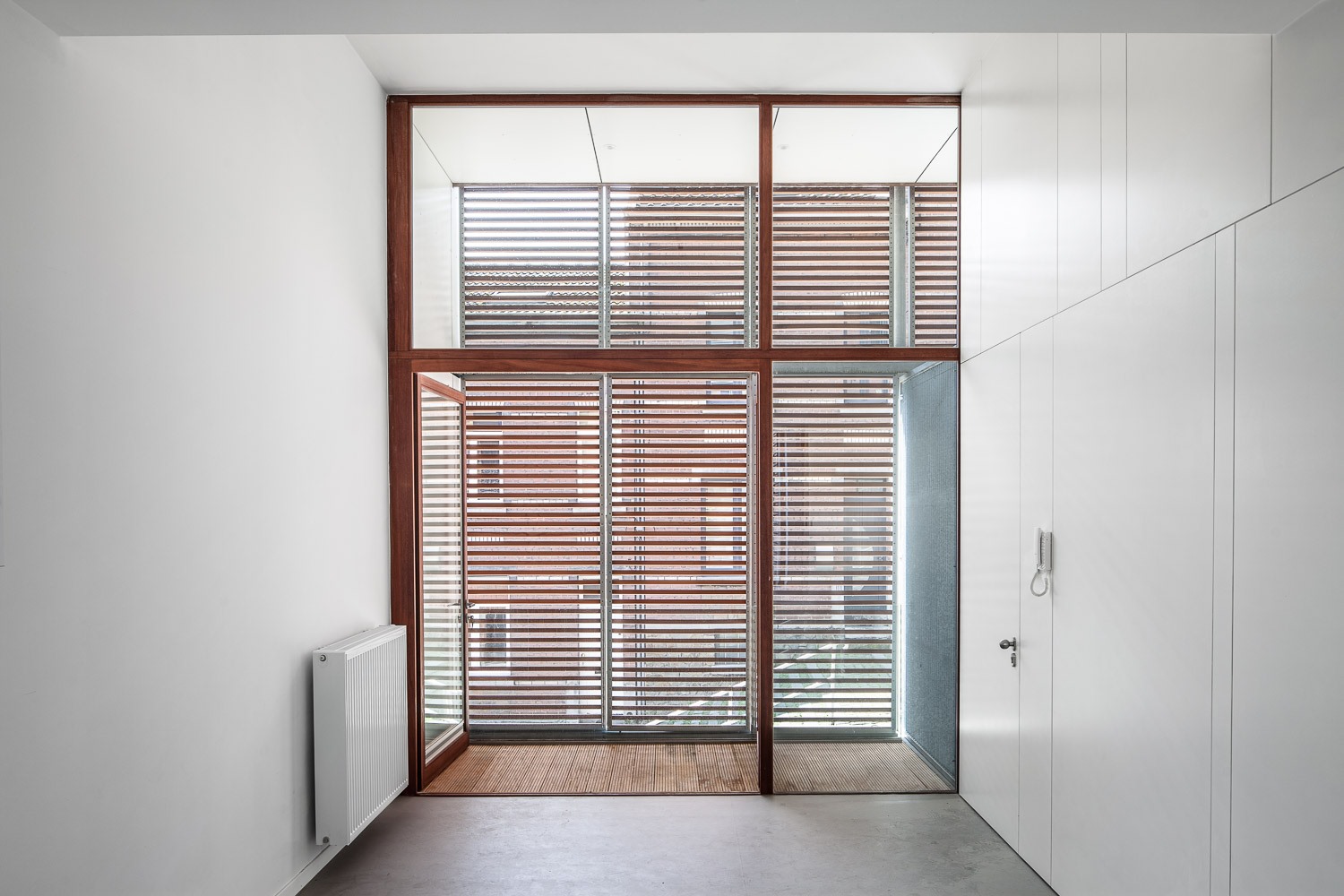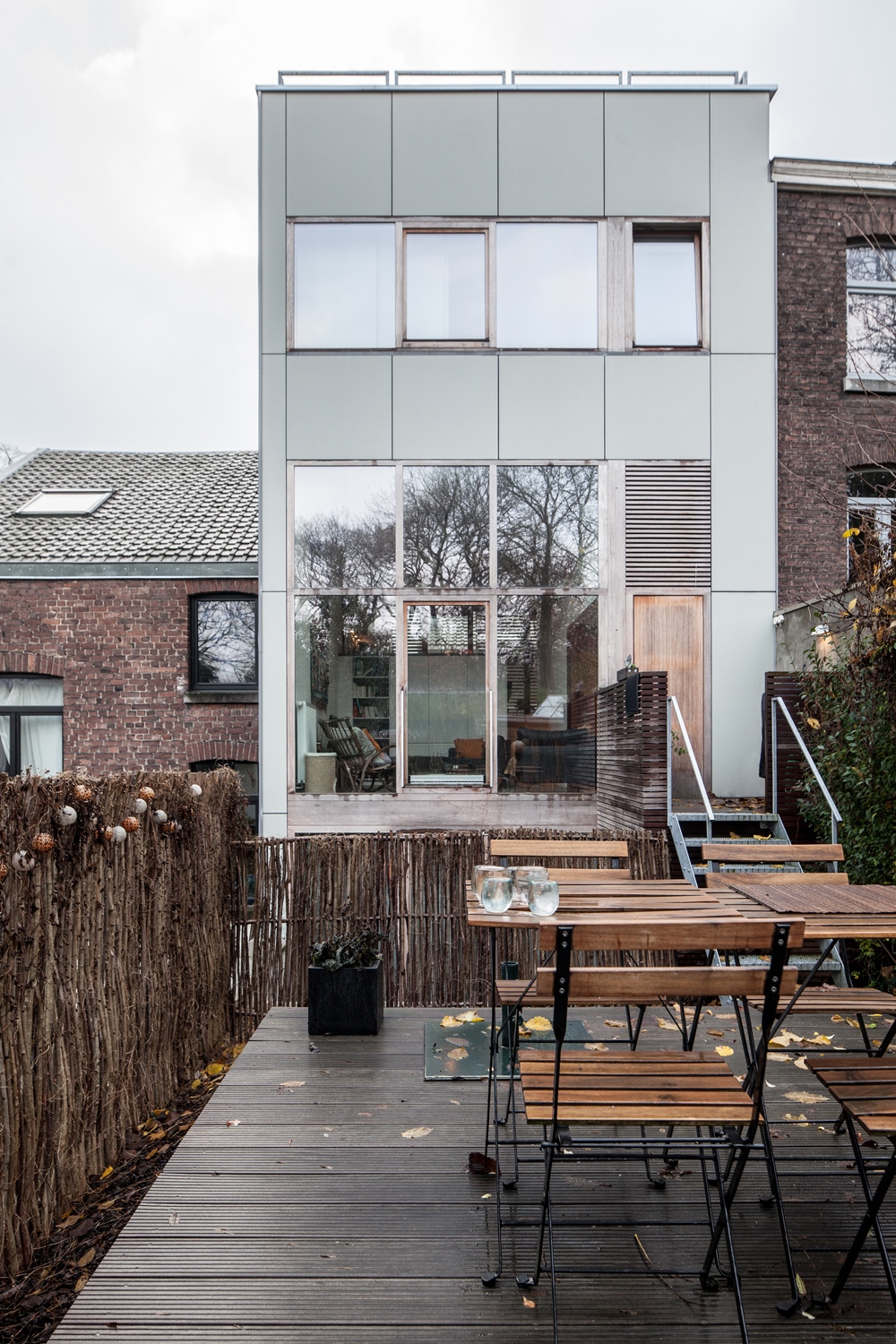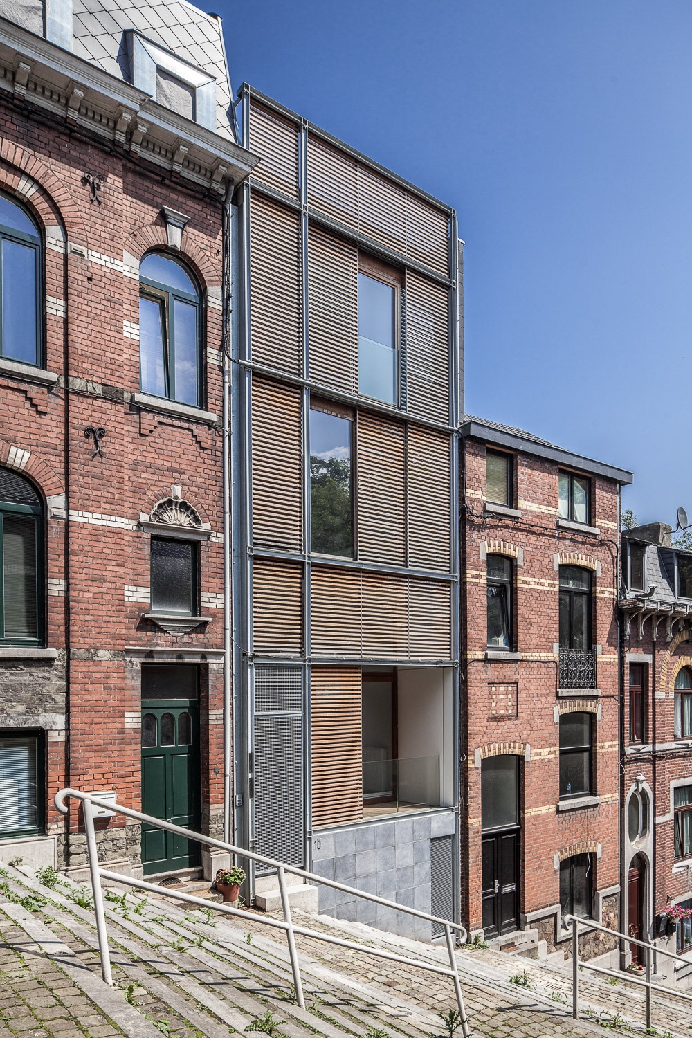 Conçu comme la prolongation d’un parcours débutant au pied de l’escalier de la rue des Jonquilles et se terminant sur une toiture-terrasse, il met l’habitant en contact permanent avec son lieu. Le projet s’est également façonné autour des contraintes fortes spécifiques au lieu : étroitesse de la parcelle (inférieure à 5 mètres), terrain en pente dans une rue en escalier orientation sud à rue.