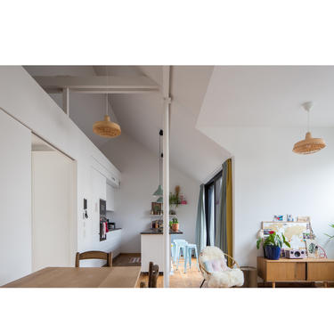 Le projet se caractérise à l'extérieure par trois interventions majeures. Au rez-de-chaussée, la porte d'entrée retrouve son empreinte initiale. Au premier étage, le logement du jouit d'un espace extérieur grâce à l'ajout d'un blacon en béton coulé sur place "agraphé" à la façade existante à Rue. En toiture, une lucarne posée sur la corniche existante, ainsi qu'un grand coulissant décalé en plan par rapport à l'alignement de façade permettent d'optimiser les vues offertes et d'implanter une petite terrasse dans le volume de toiture.