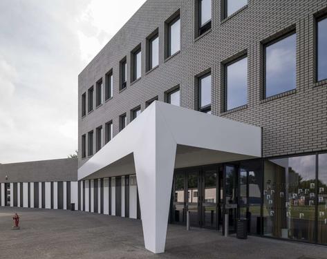 - L’implantation à front de voirie donne une visibilité renforcée de l’institution vis-à-vis de la collectivité. Nous avons été attentifs à préserver le caractère arboré et aéré de la parcelle tout en proposant une implantation qui redonne du sens à la partie haute du site. Nous avons également veillé à ne pas fermer l’ilot et à permettre les vues et déplacements traversant.[...]